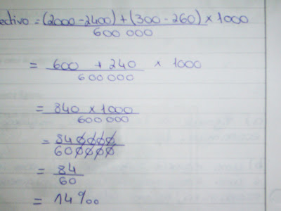 Aqui vai mais uma para a colecção dos inúmeros disparates que tenho de ler quando corrijo testes. Muitos destes alunos que demonstram uma profunda ignorância ao nível do cálculo matemático defendem-se afirmando que a culpa é minha, por não deixar utilizar a calculadora nas aulas de Geografia. Reparem bem: o cálculo exigido é uma simples divisão de 36 por 60. Ensinei nas minhas aulas de Geografia a forma correcta de realizar divisões. Muitos alunos agradeceram e disseram-me que o uso da calculadora na disciplina de Matemática faz com que não pensem. Aqui têm a prova disso. Este aluno percebeu a forma de calcular a taxa de crescimento efectivo e fez as operações correctas até chegar à conta final. Aí foi o descalabro. Porquê? Simplesmente porque o professor é exigente e o obrigou a raciocinar.